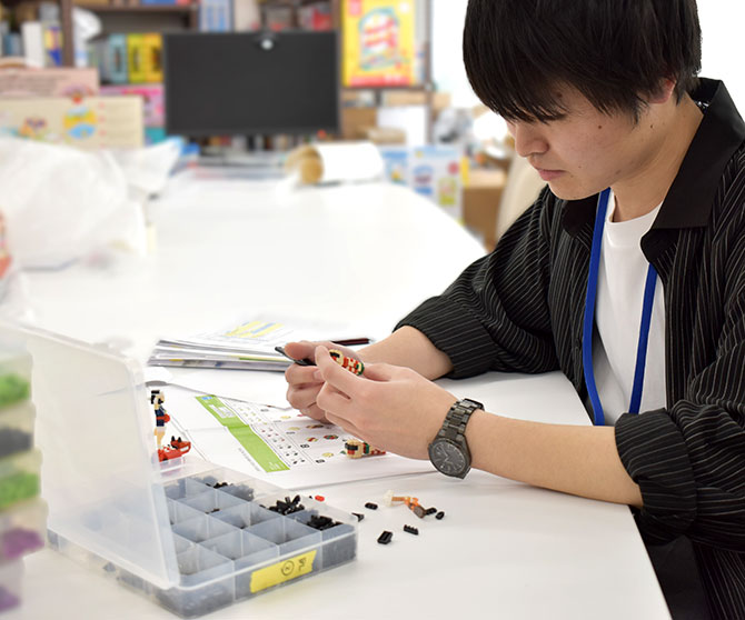 業務内容としては、商品の企画立案に始まり、実際にブロックでの試作からパッケージデザイン、組立説明書の制作まで幅広く行っています。